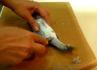 - Положите рыбу на доску и удерживая левой рукой за голову, соскребите чешую острым ножом, начиная с хвоста.